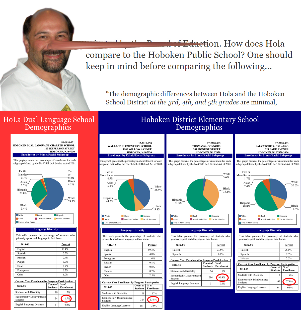 The dishonest HoLa Trustee Petrosino even posted a cooked graph (corrected by GA below). The cooked graph was part of Petrosino's disinformation campaign against the Hoboken Board of Education, to advance the confabulation that Hoboken district demographics are similar to HoLa's.