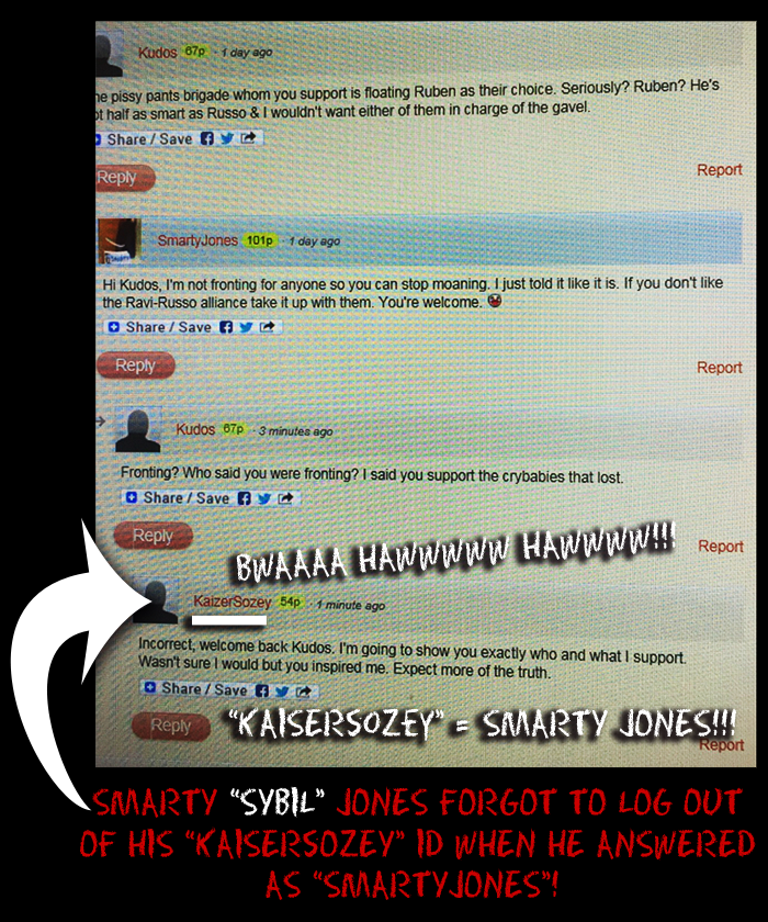 Smarty Jones forgot he was logged into one of his screen names today- he answered as Kaiser Sozey! Ha ha ha ha ha I happened to go to his site right after the dummy f*cked up so I took a picture before he deletes or changes it.